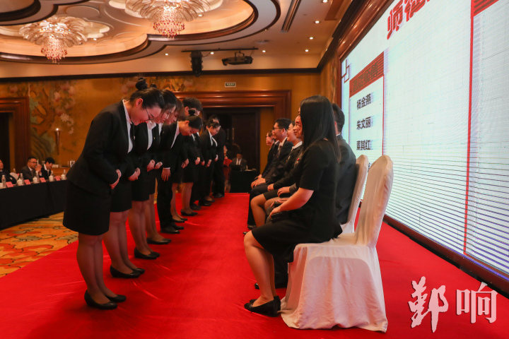 “师傅请喝茶……”5月9日,20名18级酒店专业新生“徒弟”向师傅行拜师礼,三鞠躬、双手奉茶。随后,来自酒店和学校的师傅向这群大学生“徒弟”回礼。