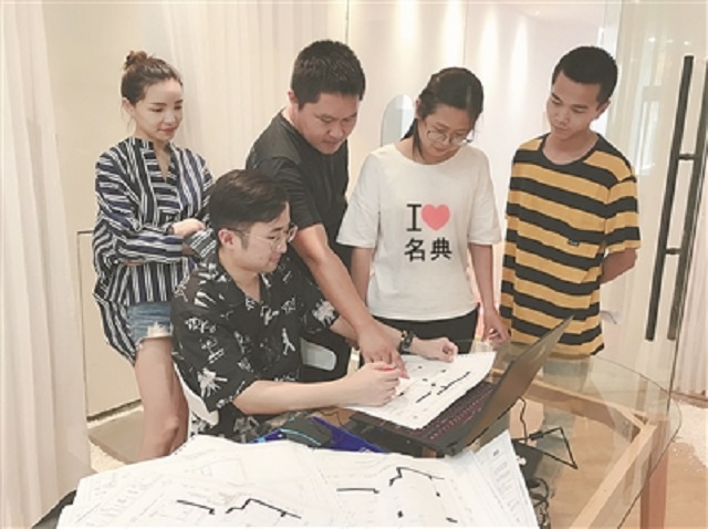 设计师和项目经理给胡颖(右二)讲解平面布置图。