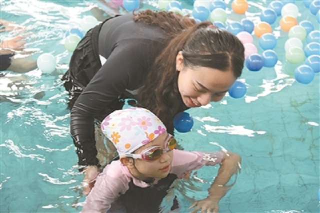 浙江经贸职业技术学院的志愿者陪孩子学习游泳。