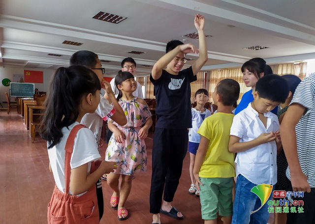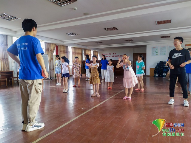 图为排练期间,志愿者带领“小竹笋”们练习舞蹈节目。中国青年网通讯员王子宁摄