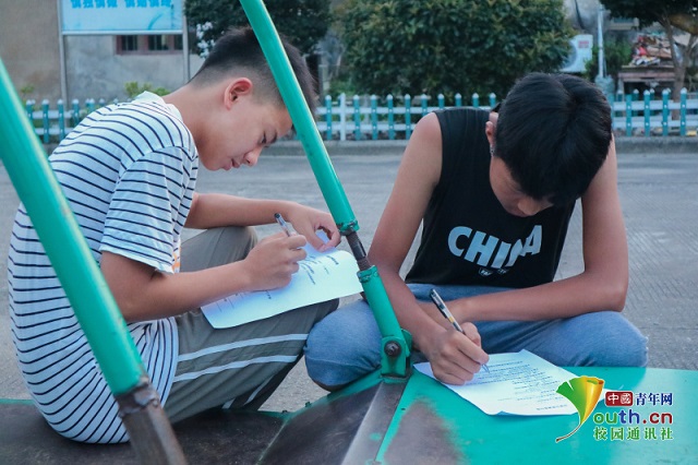 图为两位小朋友正在篮球架下填写关于垃圾分类的调查问卷。中国青年网通讯员王子宁摄