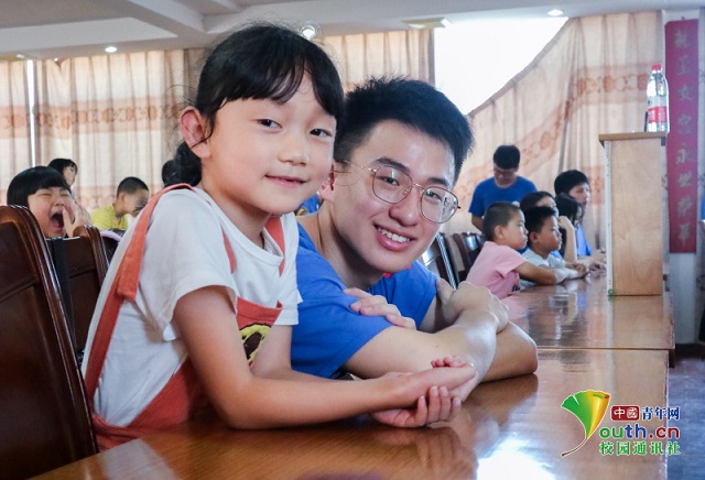 图为课间一位小朋友和一位志愿者正在谈论课上没听懂的内容。中国青年网通讯员王子宁摄