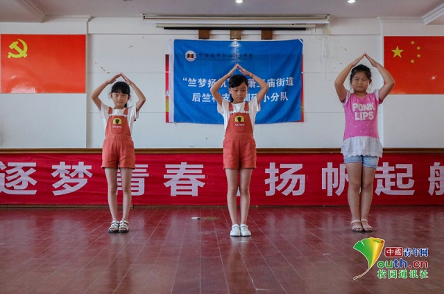 图为汇报演出中,三位“小竹笋”们正在表演手语舞《国家》。中国青年网通讯员王子宁摄