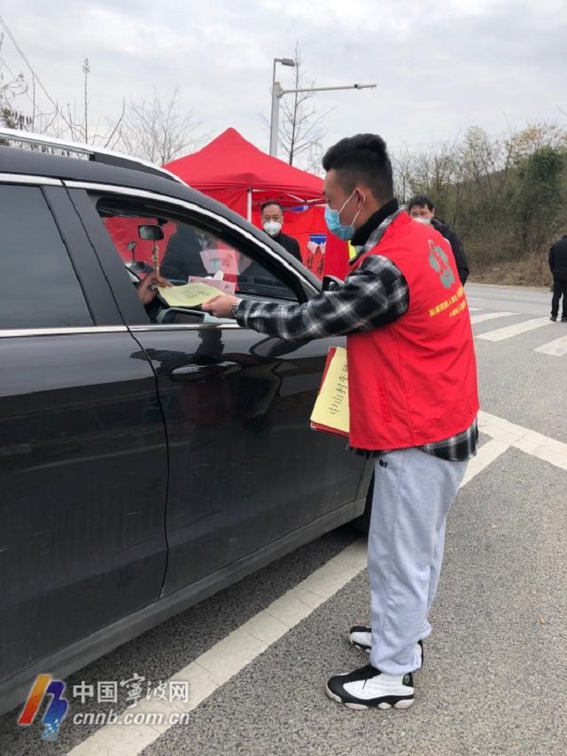 韩涛在平湖市派发车辆通行证。