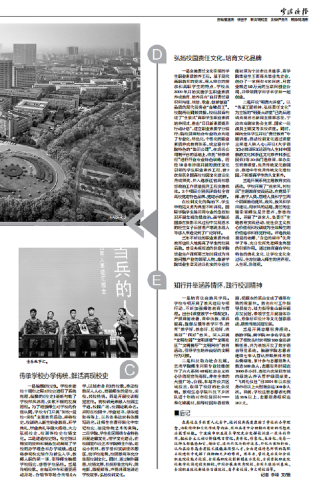 一是实施责任文化引领的学生职业素质培养工程。基于现代高职教育的要求、用人单位的需求和高职学生的特点,学校从2009年开始实施学生职业素质养成教育,培养具有“良好责任意识和沟通、诚信、敬业、创新创业”品质的现代服务业“金牌员工”。校院两级同频共振,校级层面构建了“全景式”高职学生职业素质培养模式,推出“日日新素质提升行动计划”,建立职业素质学分银行;院级层面结合专业特点构建了专业化、特色化、个性化的职业素质养成教育体系,成立富有学院特色的“集团公司”,在班级公司制平台的基础上,依托“精修课程”进行行业专业特色训练。历经10余年持续开展的责任文化引领的学生职业素养工程,曾2次荣获全国高校校园文化建设优秀成果奖,并入选浙江省高校思想政治工作质量提升工程实施载体。2个项目分别获评首批全省高校党建特色品牌、党建示范群。
