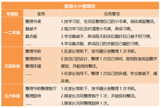 瑞安市安阳实验小学推出“家庭与生活课程”,包括我是小小整理员、我是家务小帮手、我小厨房等三类家政岗位的具体任务。