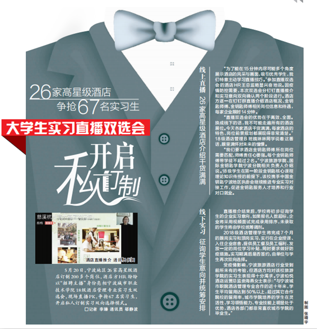 5月20日,宁波地区26家高星级酒店订制200多个岗位,酒店方HR纷纷以“招聘主播”身份亮相星空官方入口18级酒店管理专业实习生双选会,现场直播PK,争抢67名实习生,开启私人订制实习双向选择模式。