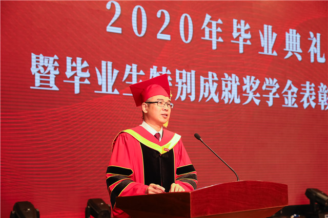 毕业典礼在庄严的国歌声中拉开帷幕。院长史习明作了题为《相信未来》的讲话。他勉励全体2020届毕业生,在未来的生活工作中,一要志存高远,看得见未来才能拥有未来。希望同学们志存高远,迎时代之难、国家之难而上,成为新时代有情怀、有潜力的“后浪”,与祖国共奋进。二要脚踏实地,耐得住平凡才能收获不平凡。希望同学们身处平凡时,不怨天尤人、不自暴自弃,不在平凡中迷失自己,不让自己由平凡堕落为平庸,而是在平凡中汲取养分,在平凡中锤炼品德,在平凡中锻炼能力。三要胸怀宽广,用平和的心态面对人生的潮起潮落。希望同学们常怀“后顾之忧”,晴天要备雨天伞,盛时要做衰时想,顺境要想逆境来。期盼同学们在未来的人生中得意不张扬,失意不消沉,顺境不失态,逆境不失志,用平和的心态面对人生的潮起潮落。