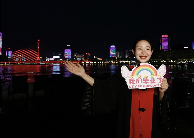 “大家看,我们现在所处的位置是宁波三江口,三江口是奉化江、余姚江和甬江,三江汇流之处,‘走遍天下,不如宁波江厦’……”6月29日晚上,在宁波三江夜游的游船上,一位身穿毕业服的女生,正在直播镜头前,介绍着宁波三江口的璀璨夜景。
