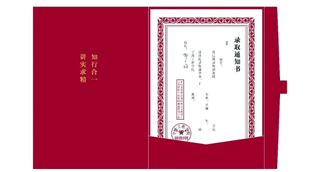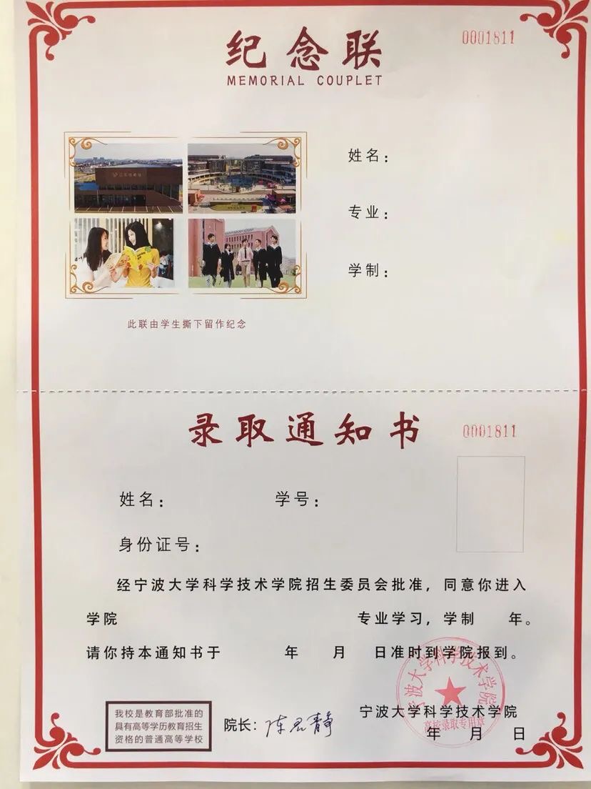 宁波大学科学技术学院的录取通知书采用学院标志底色“科院红”,封面上印有学院院训——“怀虚涵育 修己立人”。