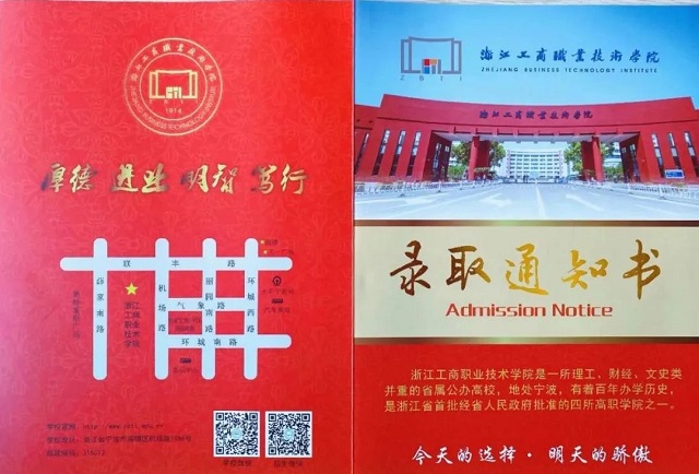 浙江工商职业技术学院的录取通知书以红色为主色调,饰以传统纹样,洋溢着浓浓的中国味道和喜庆气息。