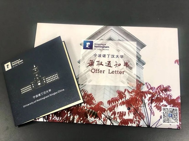 宁波诺丁汉大学的录取通知书为立体贺卡,封面采用了分层设计的理念,勾勒出地标建筑钟楼,颇具意趣。学校还为每一名新宁诺人特别附上了一张贺卡。