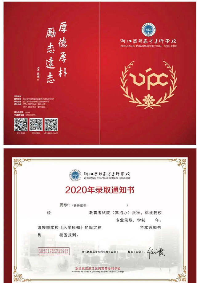 浙江医药高等专科学校的录取通知书以中国红为主色调,封面图形以英文校名(Zhejiang Pharmaceutical College)首字母 Z、J、P、C作为标志核心识别。