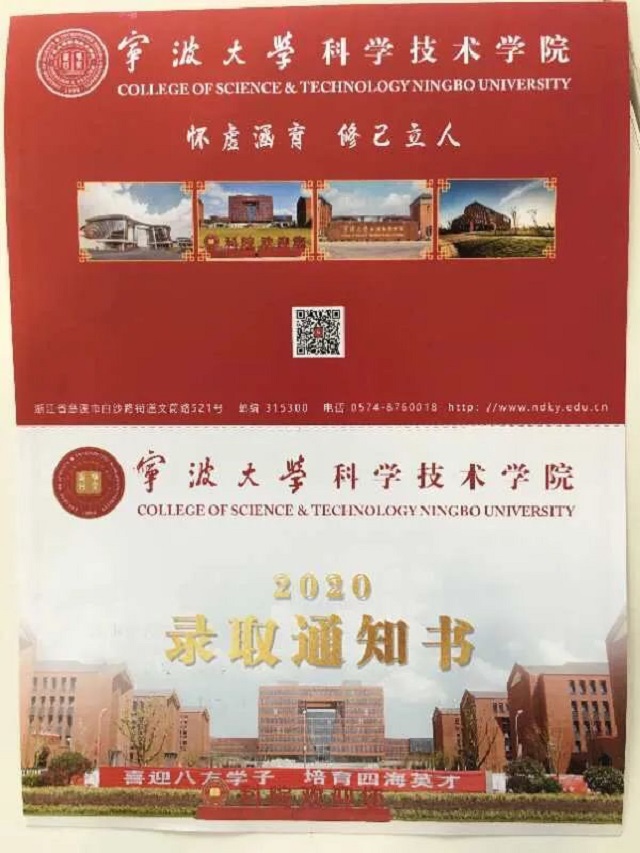 宁波大学科学技术学院的录取通知书采用学院标志底色“科院红”,封面上印有学院院训——“怀虚涵育 修己立人”。