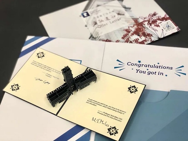 宁波诺丁汉大学的录取通知书为立体贺卡,封面采用了分层设计的理念,勾勒出地标建筑钟楼,颇具意趣。学校还为每一名新宁诺人特别附上了一张贺卡。