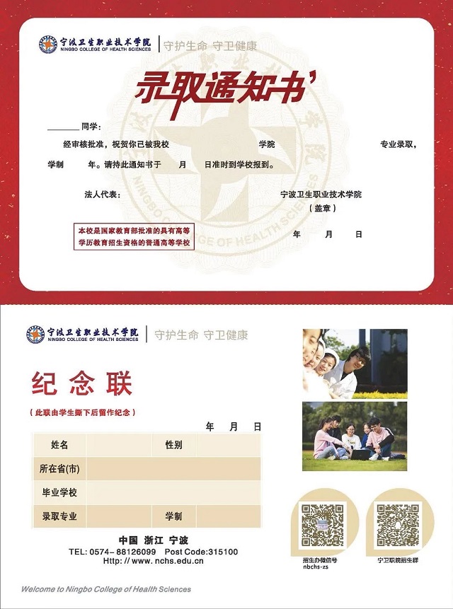 宁波卫生职业技术学院2020年新生录取通知书彰显了办学九十五年来作为全省唯一的卫生类高等职业院校的风采。