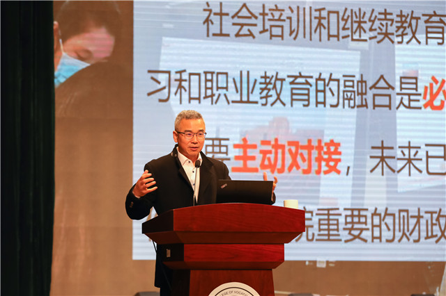 史习明指出,党的十九届五中全会对职业教育提出了新的更高要求,为学校未来发展指明了方向,召开“双高”校建设动员会是贯彻落实五中全会精神的一次实际行动。学校要按照五中全会要求扎实推动职业教育改革,深化职普融通、产教融合、校企合作,厚植高质量发展大力培养技术技能人才。围绕“我们为什么能够获批‘双高’校”、“高水平学校建设我们应该做什么”进行了深入阐述。讲到“我们为什么能够获批‘双高’校”时,他回顾了学校的办学历史;总结了学校高职教育起步早、起点高,“互联网+教学”全国领先,分类培养人才培养模式成为全国优秀案例,成为省示范性职教集团和国家现代学徒制试点学校,成为省和国家协同创新中心校,国际化综合水平全省领先等六大特色;客观分析了学校“双高”校申报过程中存在的短板。讲到“我们应该做什么”时,他提出“关键在于洞察未来”,并就未来的学校、教师、课程、学生学习、教学评价五方面做了前景描绘。最后,他提出了我们要紧密围绕高水平学校建设方案中的“一引领、四打造、五提升”进行谋划,要在全力争创“三全育人”示范校,技能大赛,提高学生竞争力,组建课程中心,全面对接国家高水平专业群,社会培训服务等上下功夫,把“四名工程”落到实处。