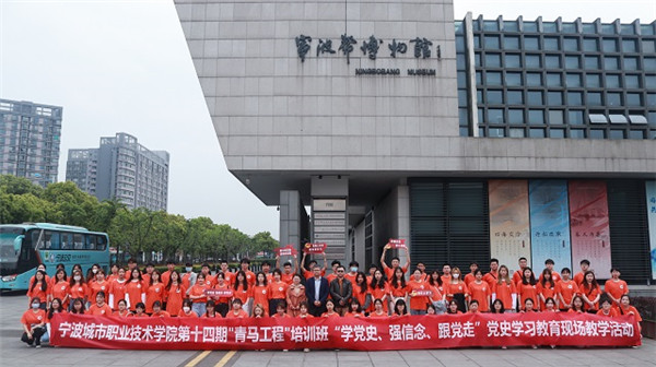 学党史、强信念、跟党走 4月28日,校团委组织我校第十四期“青马”班全体学员赴宁波帮博物馆、宁波城市展览馆等基地参加“学党史、强信念、跟党走”党史学习教育现场教学活动。本期“青马工程”培训班将党史学习教育作为贯穿课程始终的主线,结合专题讲座、现场教学、党史知识竞赛、“青年大学习·一起学党史”系列网上学习等形式,引导学员赓续红色血脉、传承红色基因、担当时代责任,在学校奋力开启建设全省“双高”校、当好中国职教“重要窗口”模范生的新征程中贡献青春力量。