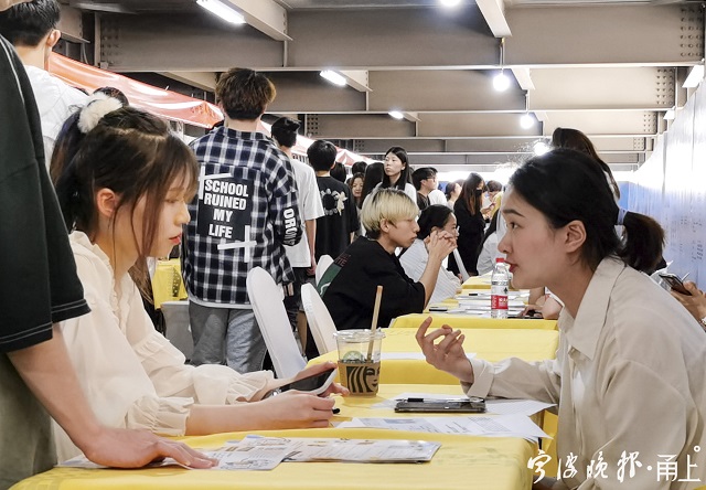 “你们单位提供住宿吗?我不是宁波人,租的地方也远......”5月26日下午,一张张青春洋溢的脸庞汇集在鄞州区集盒广场里,“就创青春,共‘鄞’未来”大学生就业创业活动在这里举行。针对毕业季大学生求职创业的需求,主办方鄞州区人力社保局在这里搭建了交流对接平台,多维度为青年大学生提供就业创业支持。需要指出的是,此次招聘会不仅有线下招聘,也有线上“直播带岗”、创业企业游学等活动版块。线上线下招聘同步进行,约有480名学生达成初步就业意向。