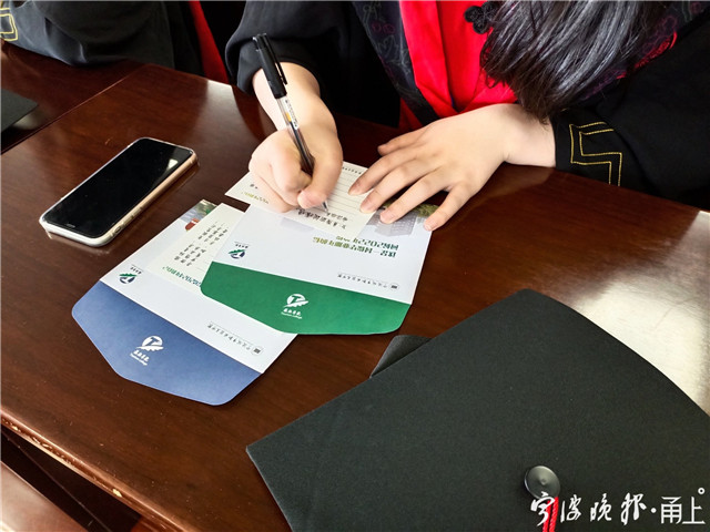 在另外一个班里,毕业生费炜炜同学则很认真地说:“我在写给三年后自己的贺卡里定了一个目标,希望三年后收到时,我已经实现了那个目标。”他仔细地将信封封好,郑重地交给辅导员老师。
