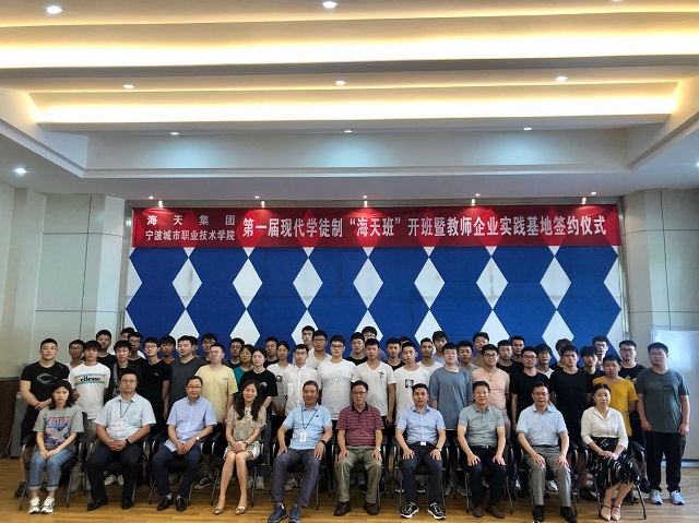 为进一步加快推进现代学徒制工作发展,提升人才培养质量,7月5日下午,第一届现代学徒制“海天班”开班暨教师企业实践基地签约仪式在海天大学举行。党委书记周国明、海天大学校长虞文贤、执行校长陈兴出席仪式。校企双方指导教师代表、第一届现代学徒制“海天班”的45名学员、相关部门负责人参加。