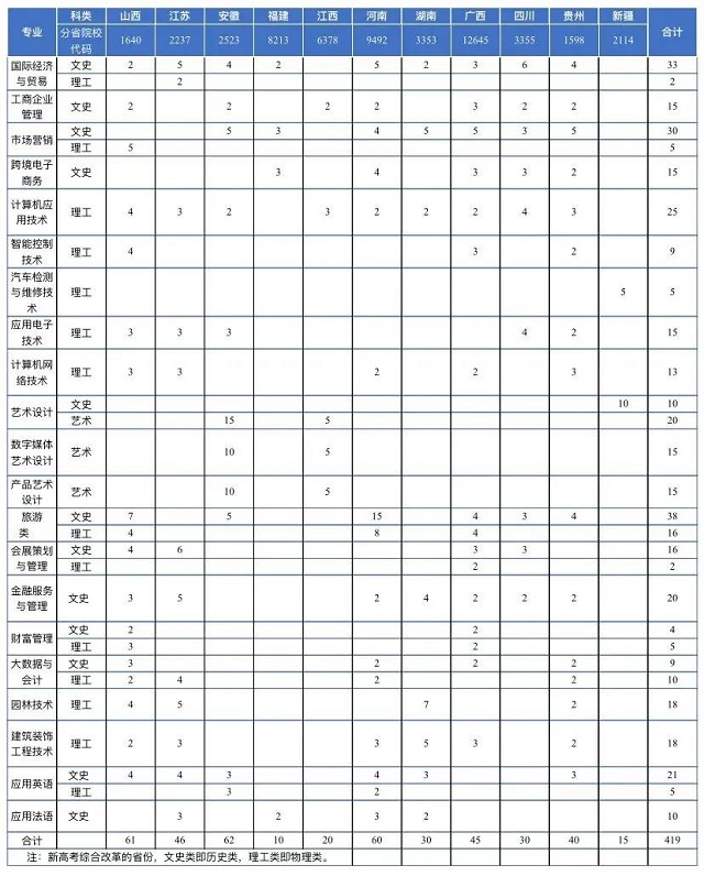 此外,学院还面向安徽、河南、山西、四川、贵州、湖南、江苏、江西、福建、广西及新疆11省份计划招生419人。