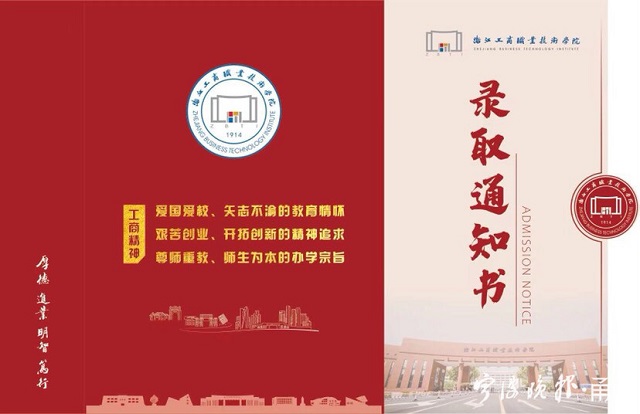 浙江工商职业技术学院的录取通知书以红色作为主色调,采取了封套加通知书内页的组合方式。其中封面上的3D立体校徽,是在反复测试了50多种材质后才最终确定。新生们收到通知书,可以把3D校徽贴贴在任何媒介上,这也是工商送给他们的一份“定情信物”。