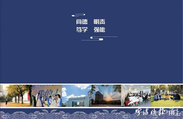 正面“录取通知书”几个字采用烫金设计,显得更为厚重和大气;背景是学校的标志性建筑—实训大楼,采用水墨风格,更显高校的文化气息。正面的下联是校训“尚德、明责、笃学、强能”,蓝底白字色调更为显眼。