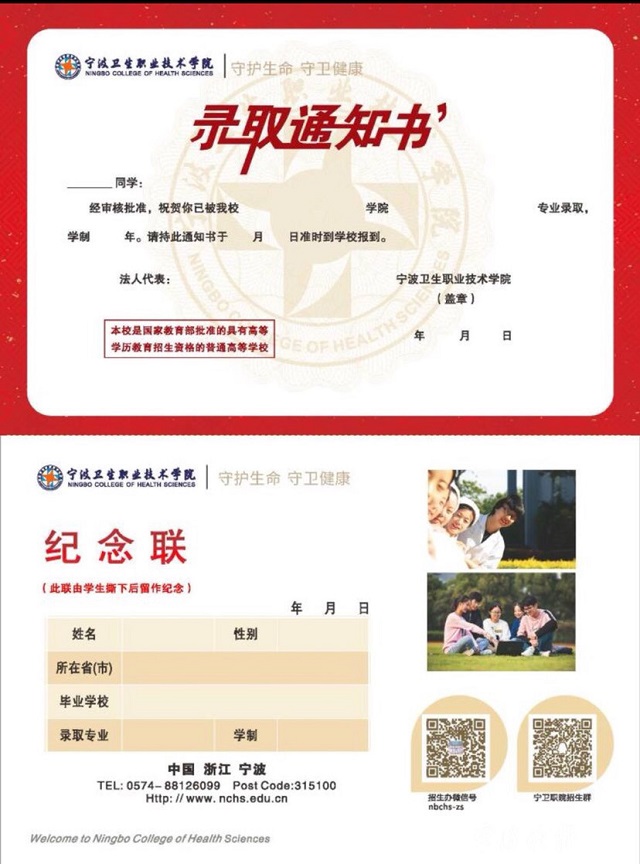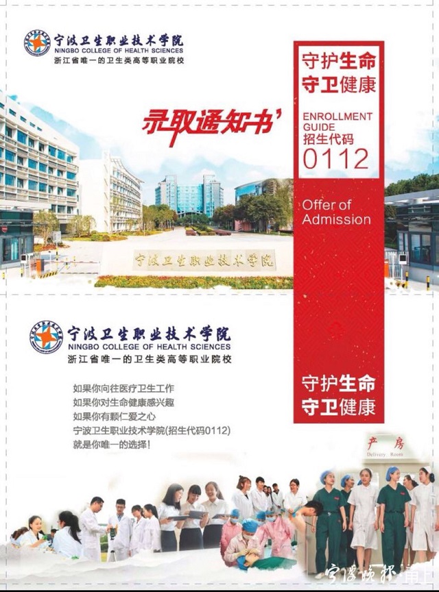 2021年新生录取通知书彰显了宁波卫生职业技术学院办学九十多年来作为全省唯一的卫生类高等职业院校的风采。