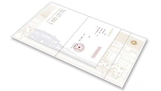 正面“录取通知书”几个字采用烫金设计,显得更为厚重和大气;背景是学校的标志性建筑—实训大楼,采用水墨风格,更显高校的文化气息。正面的下联是校训“尚德、明责、笃学、强能”,蓝底白字色调更为显眼。