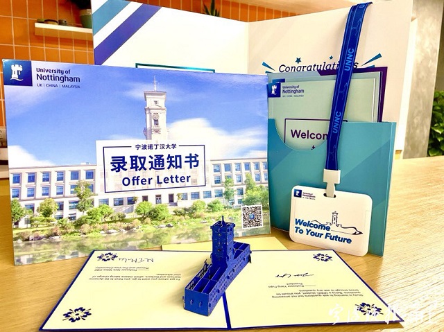 宁波诺丁汉大学的录取通知书封面以诺丁汉蓝为底色,采用宁诺的地标建筑钟楼为主体,欢迎新生即将进入校园开启人生新篇章。