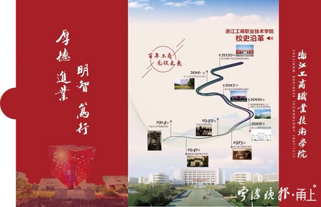 封套上还印有“厚德、进业、明智、笃行”的校训和百年工商精神,精心设计的封底底纹以学校不同时期的三个校门为主要元素,分别代表学校办学历程中的三个重要时间节点,即1914年建校、2001年升格高职和2019年学校开启高质量发展新征程。