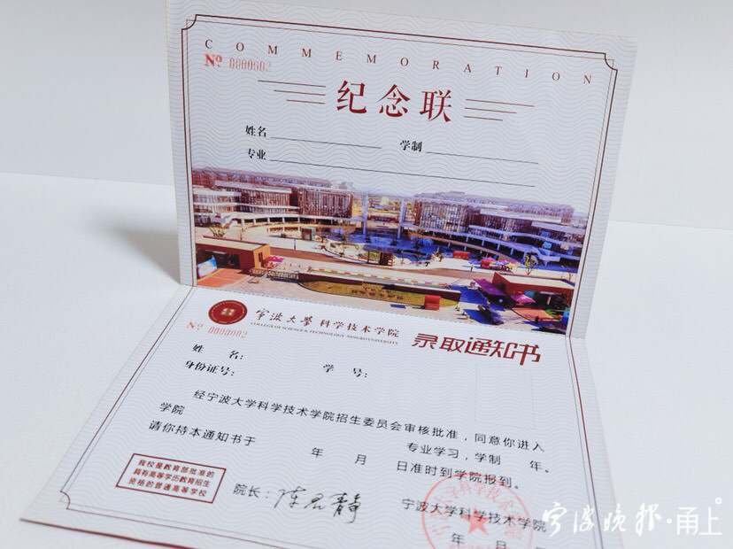 宁波大学科学技术学院今年的录取通知书沿用一贯的科院红,与学院LOGO标志同款底色,显得端庄大方。