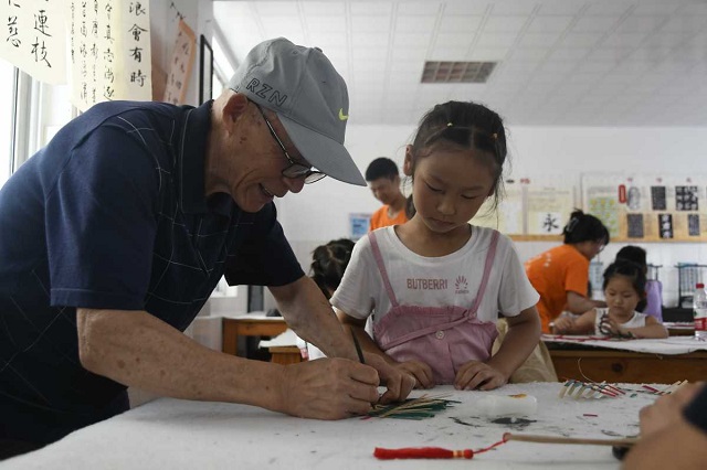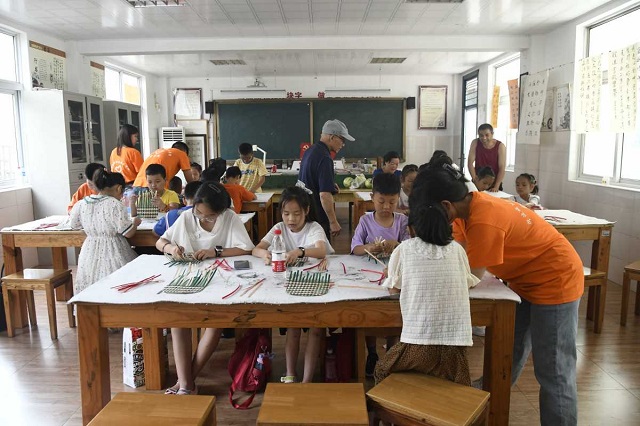队员们邀请到了当地著名竹编传承人叶良康老师,让叶老师作为匠人代表向小朋友们传授竹编技艺、竹编文化,孩子们在叶老师的指导下了解竹编文化,体会匠人匠心。小分队成员和孩子们一起构思、设计、编织竹编小扇,在队员们的带领下,孩子们体会竹编文化的魅力,也体会到了中国革命战士坚持自给自足、不拿群众一针一线、顽强斗争的革命精神。