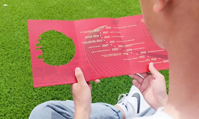 录取通知书封套主色为校庆红,以图书馆为造型背景,封面展现图书馆的大窗口元素,背面由“2”和“0”两个数字组成的跑道圆,正中间印有“遇见宁理,绽放未来”的形象宣传语,寓意new NBTers 一定能在浙大宁理绽放属于自己的未来。
