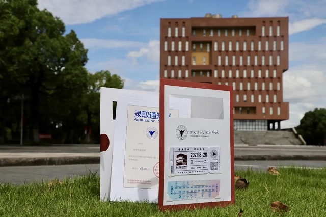 封套的纸张采用珠光纸,运用了烫金工艺,在阳光照射下璀璨耀眼,寄寓着2021新生们能够拥有闪闪发光的大学生涯。封套内含录取通知书、“报到日机票”和“20书签”。录取通知书庄重大方,“明德弘毅,开物启新”八字校训环绕四周,文字采用压印工艺,让新生通过“触摸”体会学校办学的精神内涵,将校训铭记于心,砥砺前行。