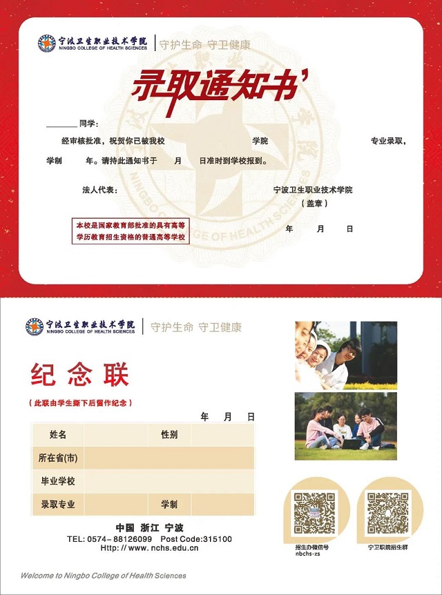 2021年新生录取通知书彰显了宁波卫生职业技术学院办学九十多年来作为全省唯一的卫生类高等职业院校的风采。学校积极响应“健康中国战略”,面向卫生健康领域,形成全方位、全生命周期的专业体系,并通过录取通知书用形象的、丰富的专业图片更直观地展示给新生。
