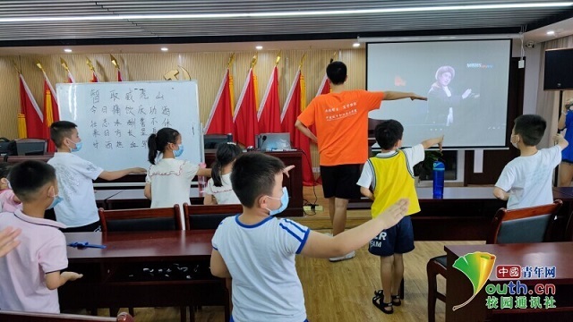 图为团队成员教小学生唱著名京剧选段《今日痛饮庆功酒》。中国青年网通讯员陈贝贝提供。