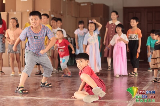 图为小朋友们跟着团队成员进行京剧动作演绎。中国青年网通讯员陈贝贝提供