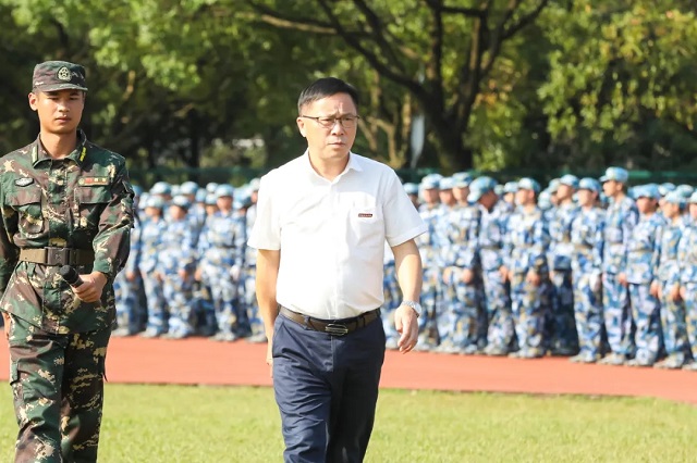 阅兵式拉开帷幕,党委书记周国明检阅了列队方阵。尽管烈日当空,同学们以蓬勃的朝气、饱满的热情、顽强的毅力出色地完成了方阵,展现出勇于挑战自我、超越自我的精神,充分展示了2021级新生丰硕的军训成果。
