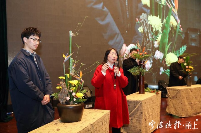 插花展示者之一20级园艺扩招班苏尘杰,今年上半年在老师的指导下,获得了浙江省职业技能大赛高职组花艺赛项一等奖。他鼓励学弟学妹们:“要想在花艺行业走的深,一定要付出非常多的时间。学校给予的平台很好,要把握机会。”