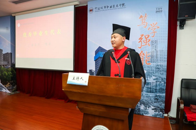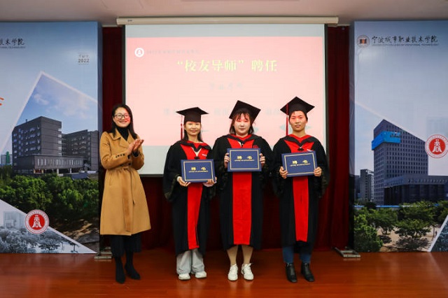 毕业典礼上,宁波城市职院校长史习明深情寄语毕业生,与社招班毕业生一一合影。