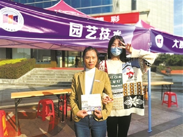 “妈妈考生”夏彩萍在“学姐”女儿的陪同下到宁波城职院报到。