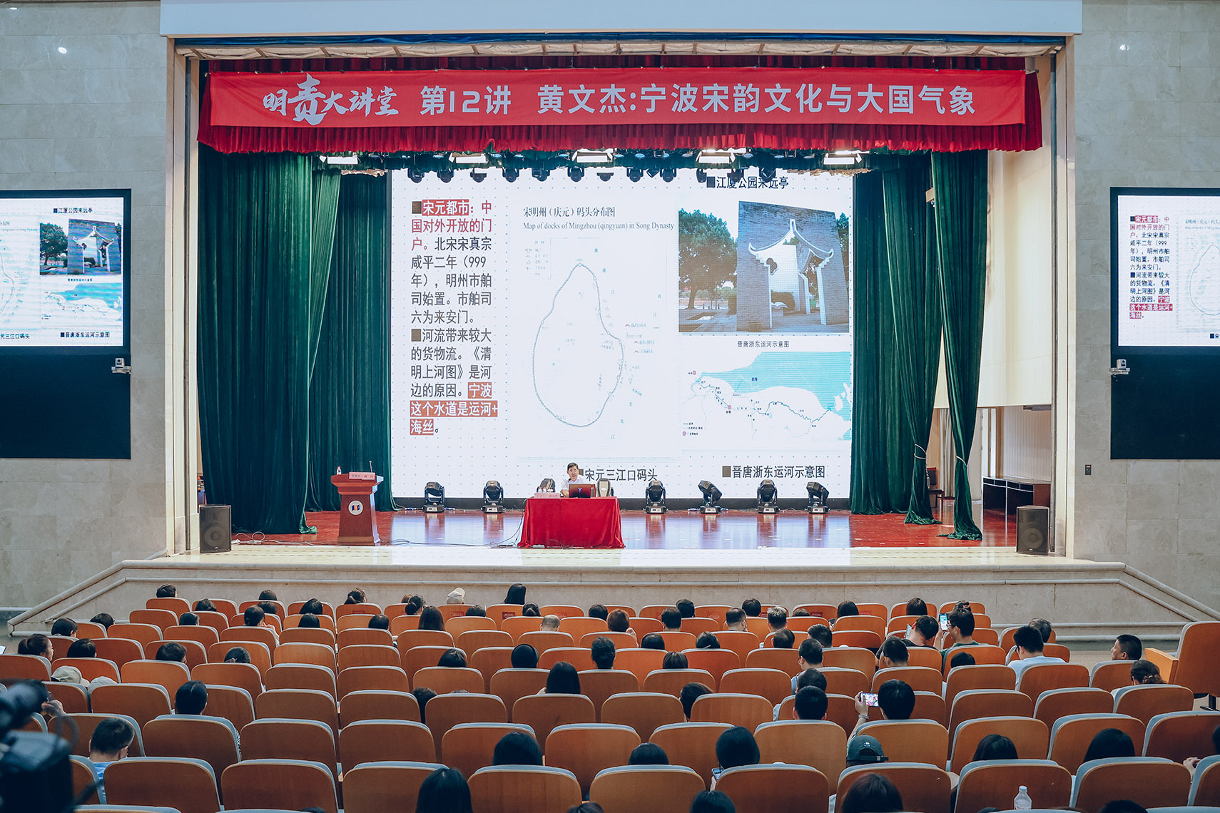 现场,黄文杰结合大量史料,为师生们详解宋韵文化的四大特征,带领大家寻迹作为河海之城的宁波所独有的宋韵气息。黄文杰表示,宁波的圣贤气象,是一种刚柔并济、开放包容的人格精神,也是崇文尚教、以民为本的家国情怀。