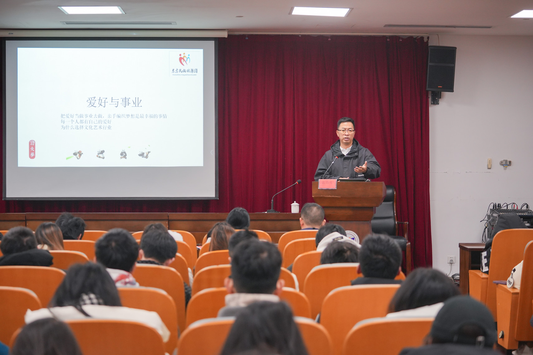 从下海办工厂到创立歌舞团,再到投身公益事业,张钧鸿以自己的创业之路和公益经历,向同学们传达了初心与坚持的重要性。“我喜欢文化艺术,所以我热爱它,我会竭尽所能,全力以赴。”在张钧鸿看来,把爱好当作事业去做,亲手编织梦想是最幸福的事情。自2011年创建至今,在他带领下,东方民族歌舞团潜心创作了20多个深受观众喜爱、具有民族特色的文艺节目,参加大大小小演出2000余场,观众达150余万人次,受到社会各界人士的一致好评。同时,他还带着歌舞团先后赴斯里兰卡、阿拉伯、意大利等国家开展民族文化交流活动,把我国璀璨的民族文化传播到了世界各地。