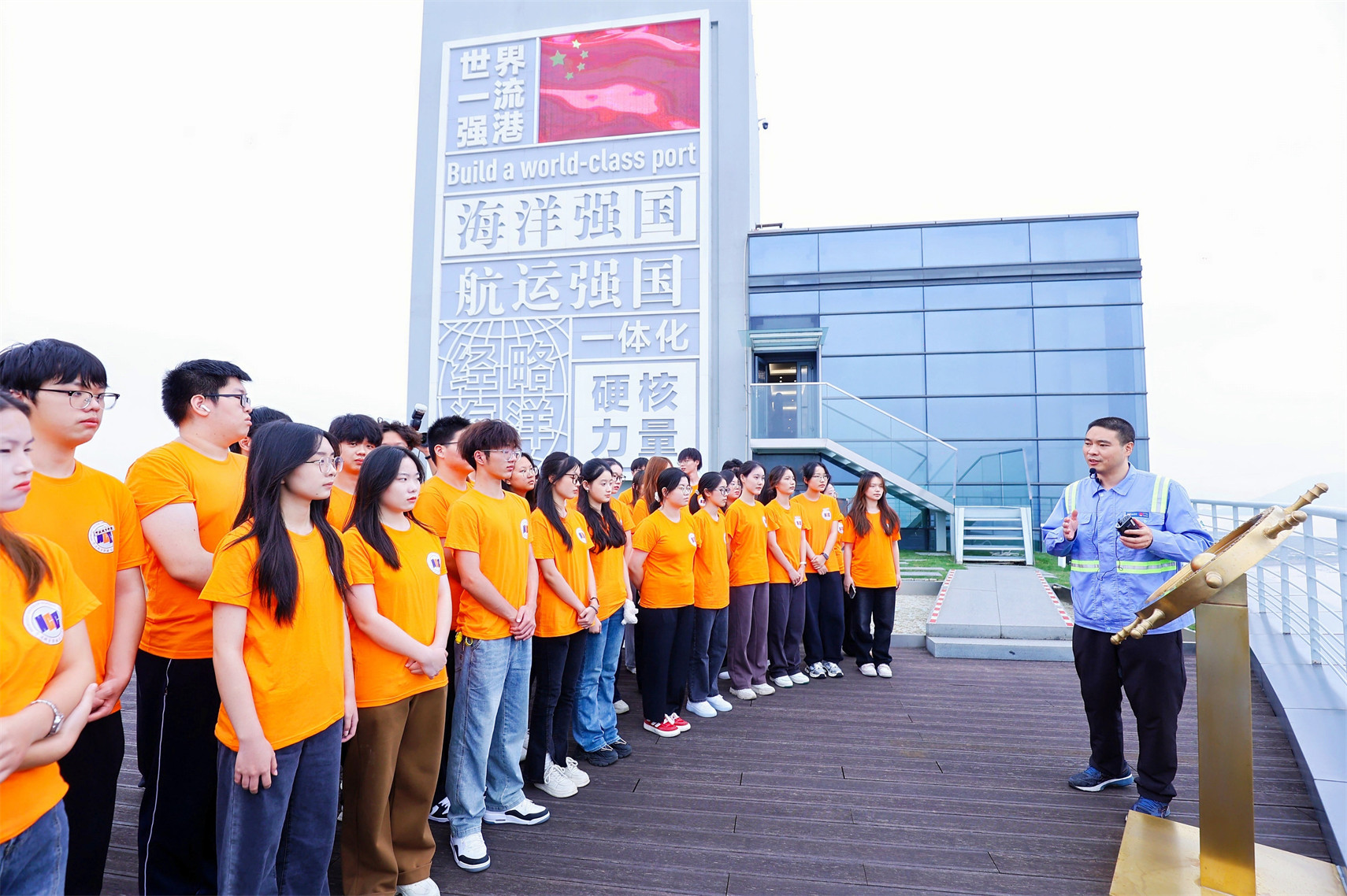 当日,在竺士杰的带领下,同学们首先来到宁波北仑第三集装箱码头有限公司展厅,了解宁波舟山港的发展历程。“宁波舟山港年货物吞吐量连续15年位居全球第一,年集装箱吞吐量稳居全球第三。”竺士杰的介绍,引来现场一片赞叹。走上观景台,同学们更被眼前的景象所震撼:巨大的货轮整齐停靠,岸桥繁忙作业,集装箱堆场如同钢铁森林,一片繁忙有序的景象。竺士杰在现场向同学们详细介绍了港口的作业流程、智能化管理等情况,让同学们对港口物流有了更为直观的了解。