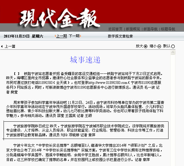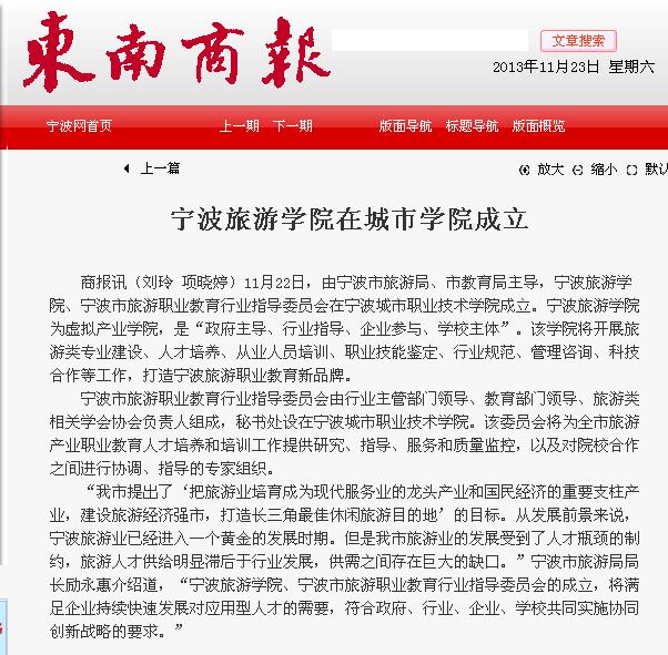 《宁波在线》:宁波旅游学院成立 强化人才培养 促进旅游产业升级