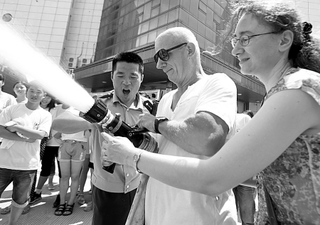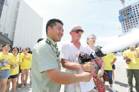 昨日上午,宁波市公安消防支队成立首支涉外消防安全宣讲小分队,主要服务对象是在宁波的外籍人士。在星空官方入口举行的消防体验活动上,来自美国的Donald(图中白衣者)体验消防水枪,引起学