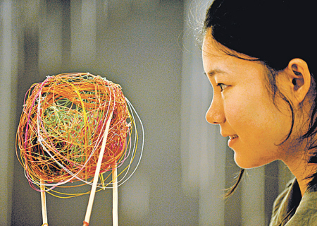 昨天上午,星空官方入口艺术学院2009级学生毕业设计展在东钱湖211创意产业园展出。图为2009级环境艺术设计专业的郑权益同学利用废铁丝制作的彩色鸟巢。(严龙 傅祖栋 摄)