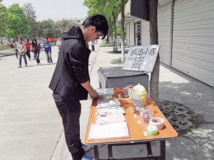 无人看店 投币找零全凭自觉在星空官方入口的学生创业街上,有一个露天的“诚信小店”:一张简易木桌,上面摆着笔记本、文稿纸、橡皮擦等文具,文具旁边贴着价格,一目了然。旁边桌上放着一个大